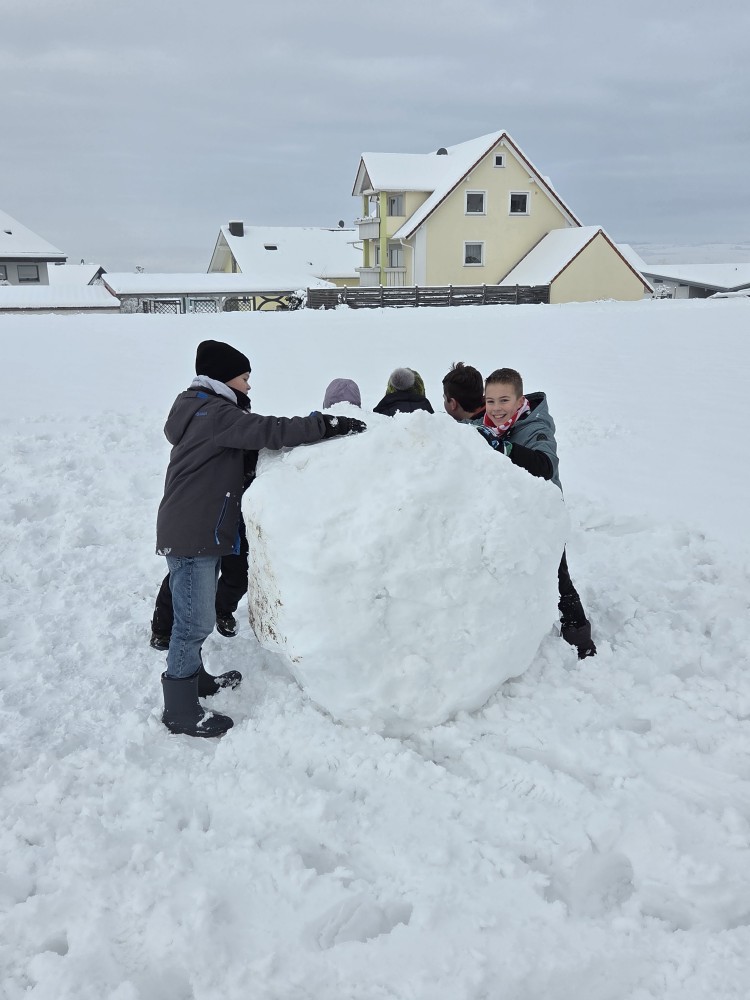 Anschließend formten die Kinder gemeinsam große Schneekugeln. Mit Teamarbeit und Kreativität entstanden daraus beeindruckende Klassenschneemänner. Jedes Kind half mit, sodass am Ende echte Gemeinschaftswerke bewundert werden konnten.